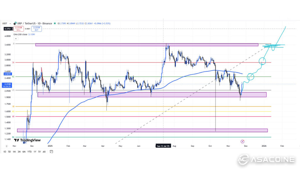 XRP در تایم‌فریم روزانه داخل یک زون حمایتی ساختاری قرار دارد و واکنش‌های اخیر نشان می‌دهد که بازار در حال جذب نقدینگی و ورود به فاز تقاضای اسمارت‌مانی است. اگرچه قیمت هنوز زیر EMA100 و EMA200 حرکت می‌کند و این موضوع فشار نزولی میان‌مدت را تأیید می‌کند، اما کاهش قدرت فروشندگان در کندل‌ها و افزایش حجم در کف‌ها بیانگر آماده‌شدن بازار برای یک چرخش احتمالی است.